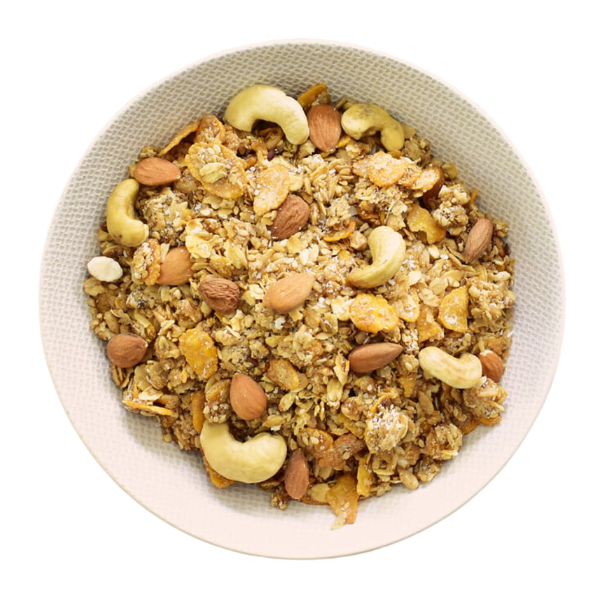 Avena, lino marron, sesamo integral, girasol pelado, copos sin azucar, miel, nueces, almendras y coco rallado