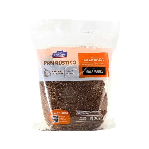 Pan rústico de calabaza La Francia, elaborado a base de harina integral, calabaza deshidratada, semillas de lino y girasol, ofreciendo un sabor único.
