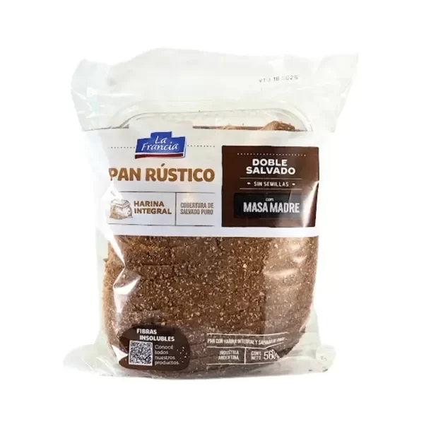 Pan rústico doble integral La Francia, elaborado a base de harina integral, salvado y avena. Con agregado de masa madre, harina integral fina, harina integral gruesa.